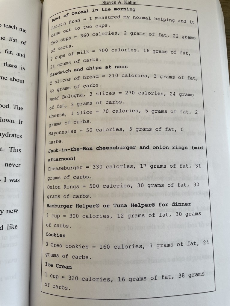 The above is a photo from my book, “My Secret Trainer”. Our main character Paige has been asked to keep a daily log of what she ate, and this was her total for one day.